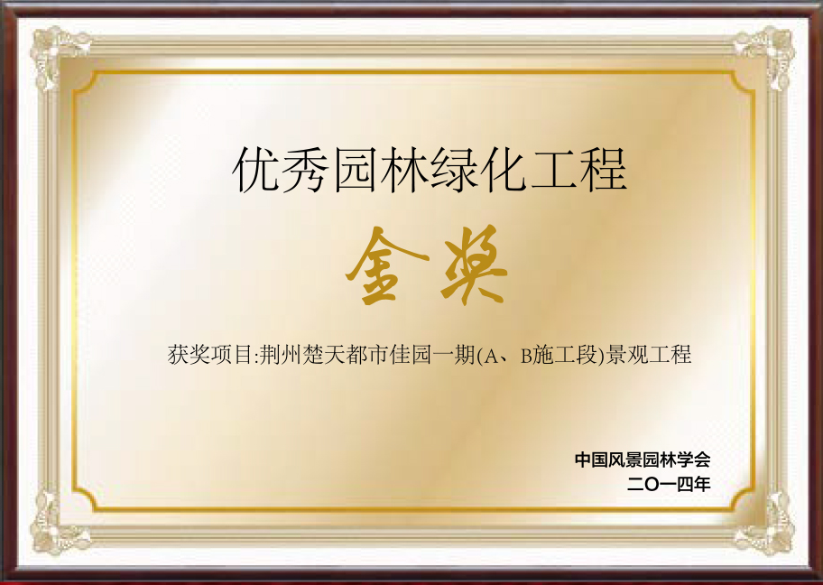 荊州楚天都市佳園一期景觀工程榮獲“優秀園林綠化工程金獎”
