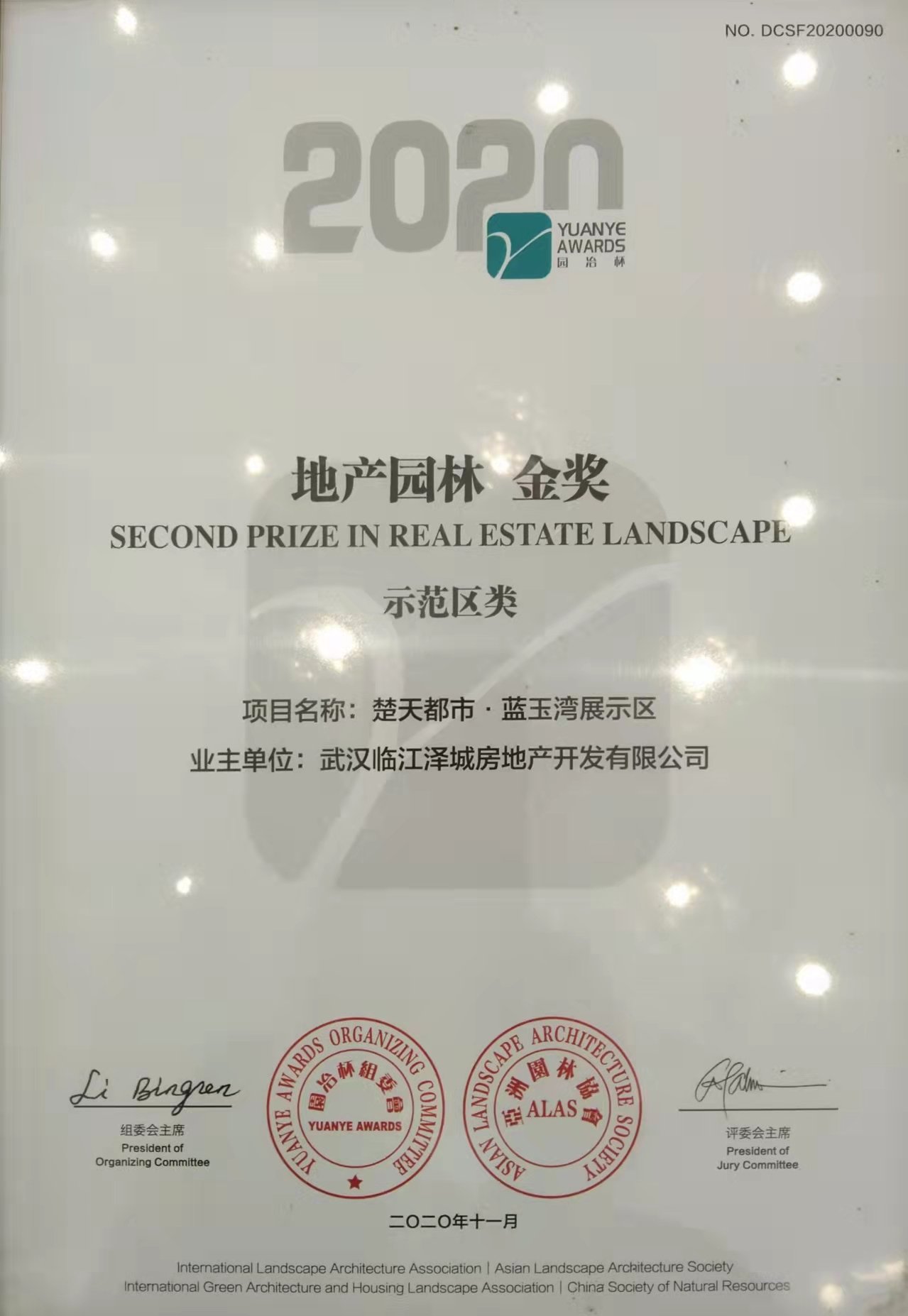 2020年11月20日,楚天都市·藍(lán)玉灣獲得(de)“第十一屆園冶杯地産園林示範區(qū)金獎”、“第十一屆園冶杯地産園林方案類銅獎”兩項大(dà)獎。