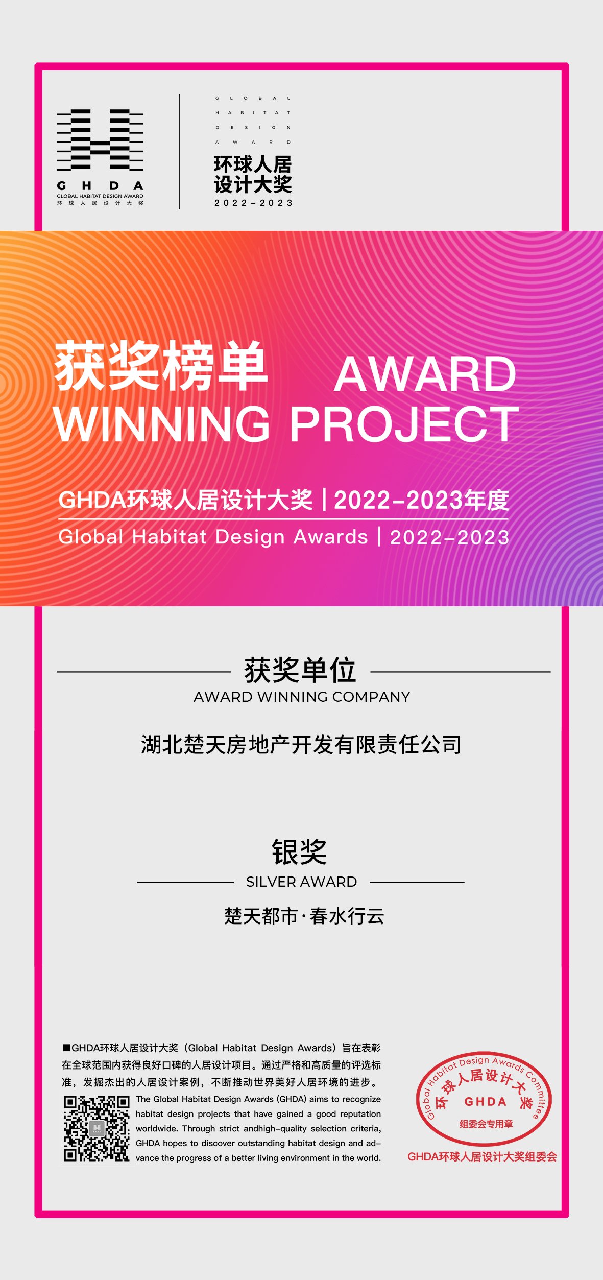 2023年7月 楚天都市·春水(shuǐ)行(xíng)雲榮獲2022-2023年度“GHDA環球人(rén)居設計(jì)大(dà)獎銀獎”