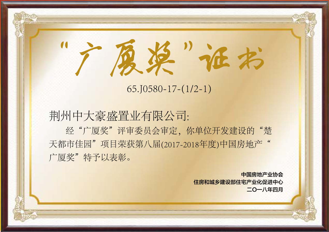 楚天都市佳園獲第八屆(2017-2018年度)中國房(fáng)地産“廣廈獎”