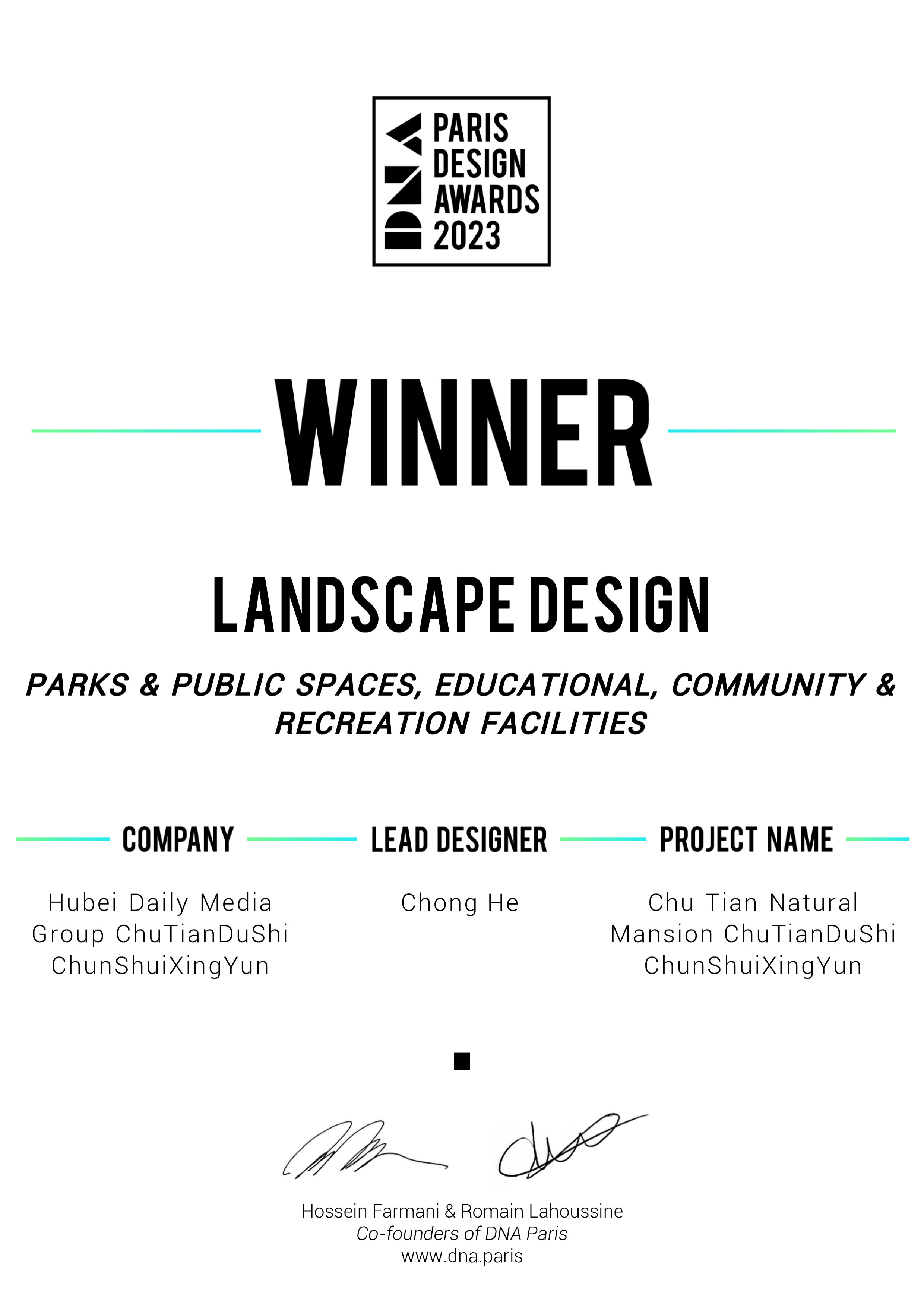 2023年7月 楚天都市·春水(shuǐ)行(xíng)雲榮獲2023年度「DNA巴黎設計(jì)獎」大(dà)獎
